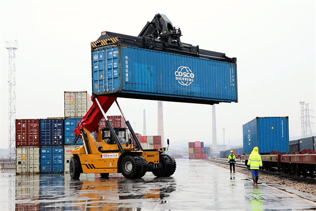 The photo shows a container loaded with automotive parts being loaded onto a freight train at the Zhuzhou Land Port. On February 11, a Hunan-Guangdong-Africa rail-sea intermodal international freight train, fully loaded with auto parts, departed along the dedicated railway line of a Hunan-based port economic and trade development company. It is heading for Guangzhou's Nansha Port before being transferred to sea transport. This marked the 2,000th train trip since the launch of the Hunan-Guangdong-Africa rail-sea intermodal international freight train service in 2021. (Photo/Meng Xianglin)