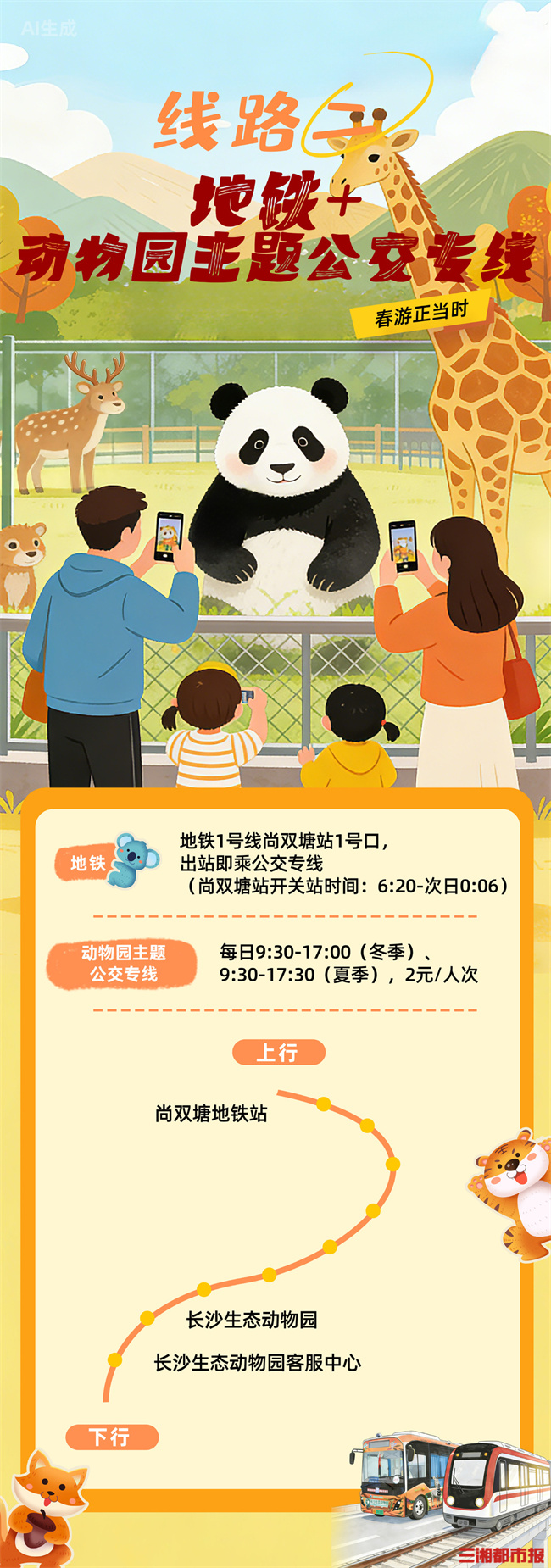 The zoo-themed bus route has been launched to meet the travel needs of family outings. This route connects to Exit 1 of the Shangshuangtang Station on Metro Line 1 (operating hours: 6:20 to 0:06 the following day). It is a regular service with a fare of 2 yuan per person. Operating hours vary by season: 9:30–17:00 in winter and 9:30–17:30 in summer. The shuttle provides direct service to the main entrance and visitor center of the Changsha Ecological Zoo.