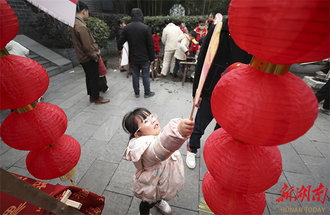 A series of folk custom activities were held in Zixing, Chenzhou, on February 10. People tried their hands at a variety of traditional handicrafts such as making ciba, a round-shaped glutinous rice cake, and making lacquer fans, immersing themselves in the charm of intangible culture heritage and intense festive atmosphere. The photo shows a kid appreciating red lanterns at the Wuling Farming Culture Museum in Zixing City. (Photo/Li Ke and He Honghai)