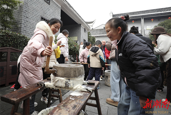 A series of folk custom activities were held in Zixing, Chenzhou, on February 10. People tried their hands at a variety of traditional handicrafts such as making ciba, a round-shaped glutinous rice cake, and making lacquer fans, immersing themselves in the charm of intangible culture heritage and intense festive atmosphere. The photo shows people partaking in making ciba at the Wuling Farming Culture Museum in Zixing City. (Photo/Li Ke and He Honghai)