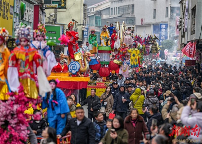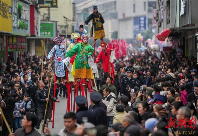 On March 2, a Changle Taige performance was staged in Changle Town, Miluo City, attracting crowds of tourists. The Changle Taige performance is a thousand-year-old folk tradition originating from the Sui and Tang dynasties (581-907) and thriving during the Ming and Qing dynasties (1368-1911). This art form evolved from ancient sacrificial rites and Lantern Festival celebrations held in the first month of the Chinese lunar calendar in ancient times, blending acrobatics, painting, opera, and folk customs. In 2011, the Changle Taige performance was included in the extended list of national intangible cultural heritage. (Photo/Song Zhengjun)
