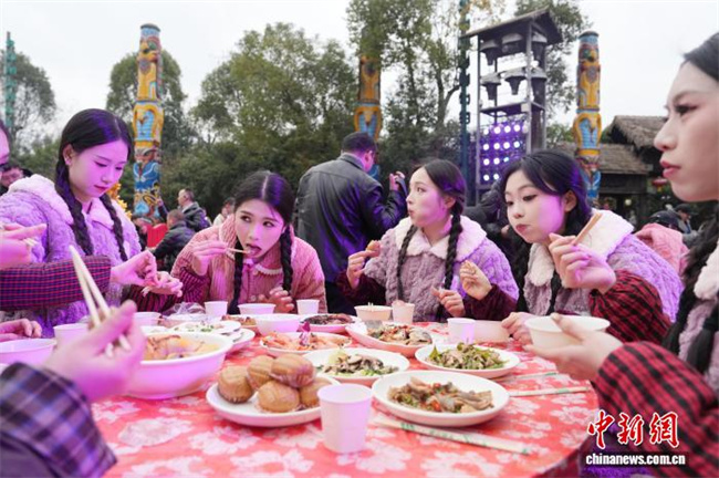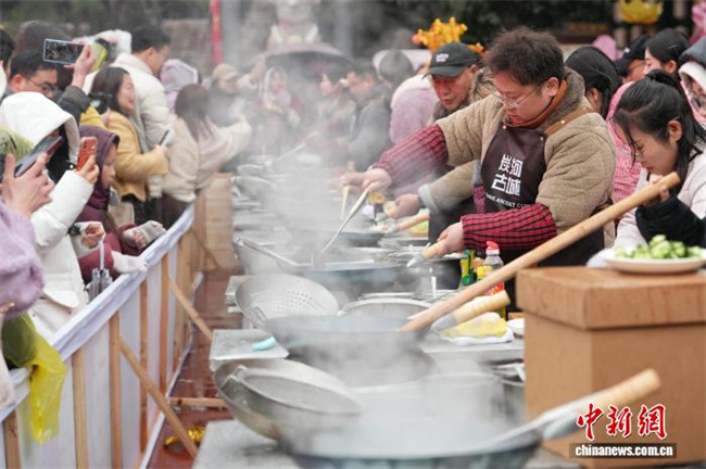 On February 7, Tanhe Ancient Town in Ningxiang City, Hunan Province, hosted the Spring Festival Kitchen God Competition, where Chinese and international contestants competed side by side to showcase their culinary skills. Participants prepared authentic Chinese delicacies on the site, exchanged insights on Chinese culinary culture, and celebrated the arrival of Chinese New Year together. The photo shows numerous contestants demonstrating their cooking skills. (Photo/Yang Huafeng, Chinanews)