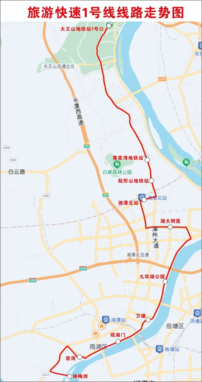 The route connects four major cultural and tourism sites—Yaowan, Guanxiangmen, Wanlou, and Jiuhuahu Park, passing through Xiangtan North Station and heading north along Tanzhou Avenue to seamlessly connect with the Changsha Dawangshan Metro Station.
