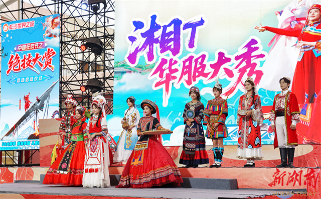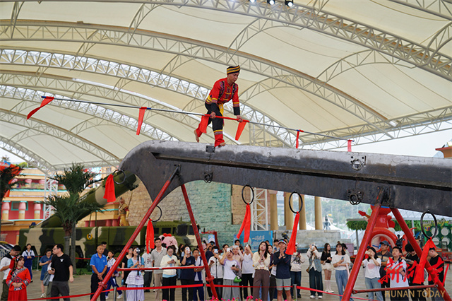 On September 29, a National Day celebration featuring spectacular skills kicked off at the Window on the World, Changsha. Intangible cultural heritage performances such as the duo high-pole stunts and Miao ethnic group's "Walking on Blades" were staged one after another. Joining spherical cinema, and other modern tech experiences, they created a festive feast that blends tradition and innovation for tourists. (Photo/Xu Xing, Hunan Daily)