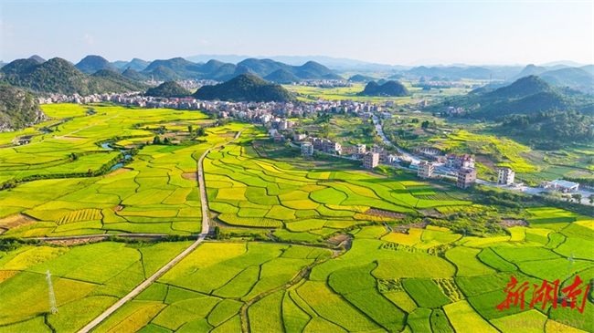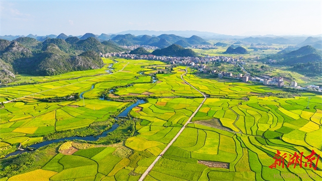 The photo, taken on October 10, shows paddy rice ripening in succession in a 10,000-mu (667 ha.) selenium-rich rice plantation in Shiyang Town, Xintian County. The vast paddy fields interweave with rivers, villages, and country roads, creating a beautiful pastoral harvest scene. (Photo/Liu Guixiong)