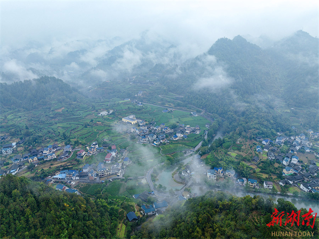 On October 30, Aikou Village in Majing'ao Town, Jishou City was shrouded in autumn rain. Tea plantations, villages, rivers, and green mountains intertwined in the misty rain, together composing a poetic ecological landscape. (Photo/Peng Jing)