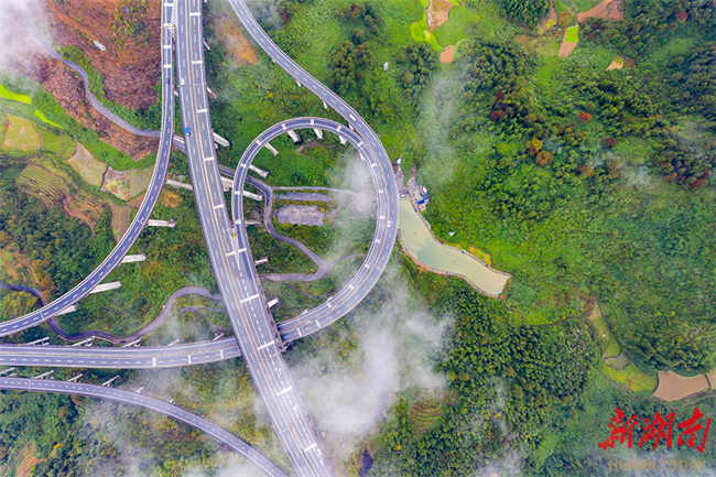 The photo, taken on November 10, shows expressways intersecting at the Shijiazhai Interchange in Shijiachong Neighborhood, Jishou City. The expressways pass through mist-shrouded valleys and mountains, hidden from view sometimes, making a majestic scene. (Photo/Liu Zhenjun)