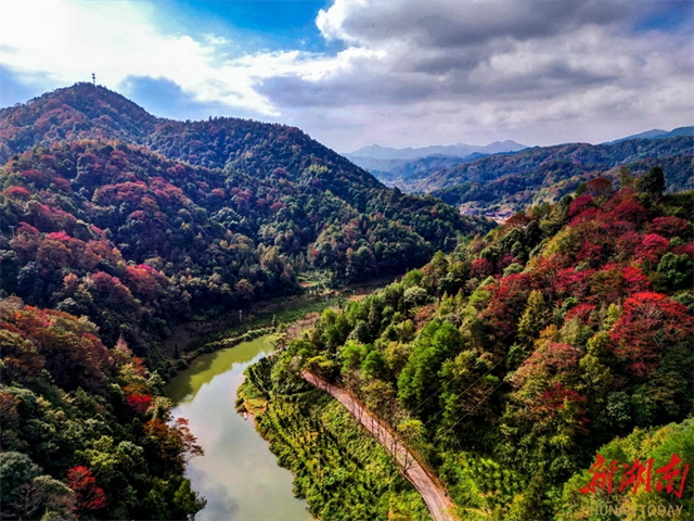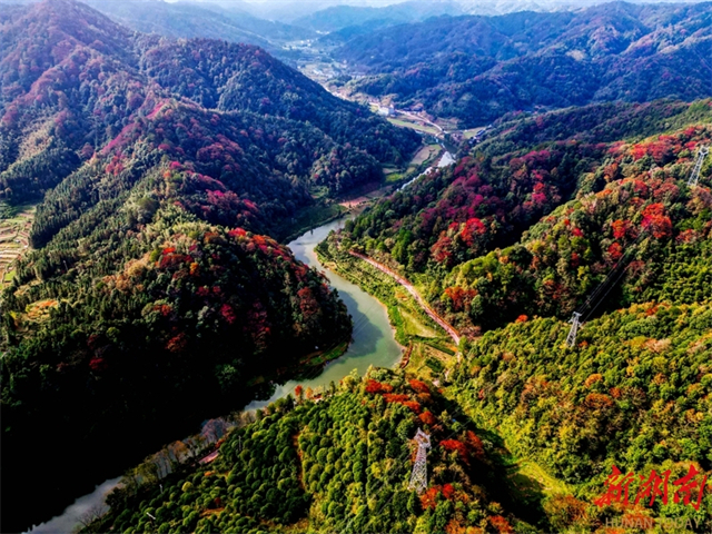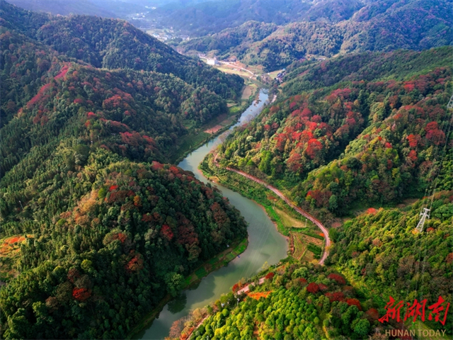 The photo above, taken on November 12, shows a breathtaking late-autumn scene in Hongxiang Village, Shuangjiang Town, Tongdao Dong Autonomous County. The vibrant crimson leaves, green mountains, pristine waters, and scattered dwellings in the secluded valley constitute a painting scroll. (Photo/Yin Xuping)
