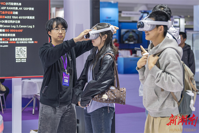 A model showcases VR scenarios at the 2025 China New Media Technology Exhibition (CMTE) at the Hunan International Convention and Exhibition Center (Mango Hall) on November 13. The exhibition is ongoing in Changsha, focusing on technology empowering the media throughout its entire workflow and across all aspects. It featured three core sections—"New Ecosystem of Intelligent Media," "New Application of Smart Media Technologies," and "New Consumption of Digital Cultural Innovation." The event aims to create a platform to showcase the achievements in technological innovations empowering systematic transformation of mainstream media, and to facilitate technology transactions and industrial collaboration. (Photo/Tong Zhenxi and Liu Shiqi, Hunan Daily)