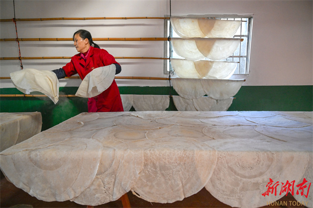 The photo, taken on January 5, shows a villager making buckwheat bean curd sheets in a workshop at Baimamiao Village, Yanjing Town, Lixian County. Every winter, locals have the tradition to make buckwheat bean curd sheets, which serve both as daily fare and as a treat for guests. As the Spring Festival approaches, numerous workshops and villagers have begun producing buckwheat bean curd sheets, turning this smooth, chewy, and nutritious local specialty into the warmest festive flavor in people's memories. Currently handmade buckwheat bean curd sheets not only evoke a sense of nostalgia, but have also developed into a distinctive industry that boosts farmers' income. (Photo/Guo Lilaing, Hunan Daily)
