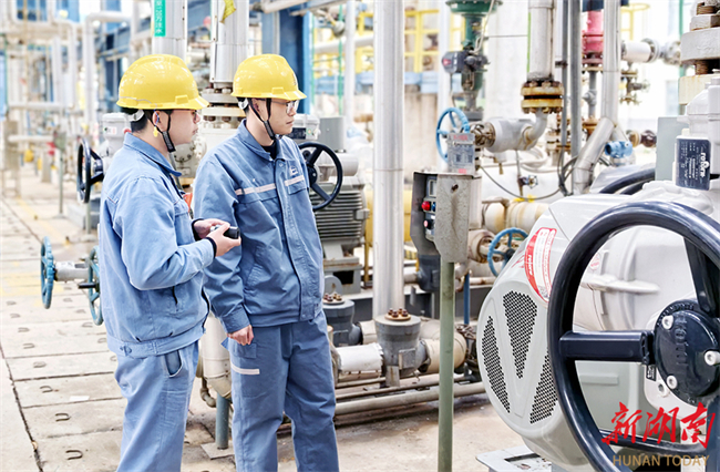 The photo, taken on February 24, shows technicians inspecting the aviation fuel production site at the SINOPEC Hunan Company. That day marked the first working day after the Spring Festival holiday. Local enterprises resumed production, striving to get off to a good start. (Photo/Peng Zhan and Li Xin)