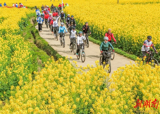 The photo, taken on March 5, shows cycling enthusiasts riding through canola flower fields in Lianghekou Village, Xianglinpu Town, Daoxian County. That day marked the begining of "Jingzhe" or "Awakening of Insects," the third of the 24 solar terms on the Chinese lunar calendar. During this period, canola flowers, tulips, violets, and other spring blooms burst into vibrant colors, drawing crowds of visitors to admire the blossoms, take photos, and immerse in the vibrant spring atmosphere. (Photo/Jiang Keqing)