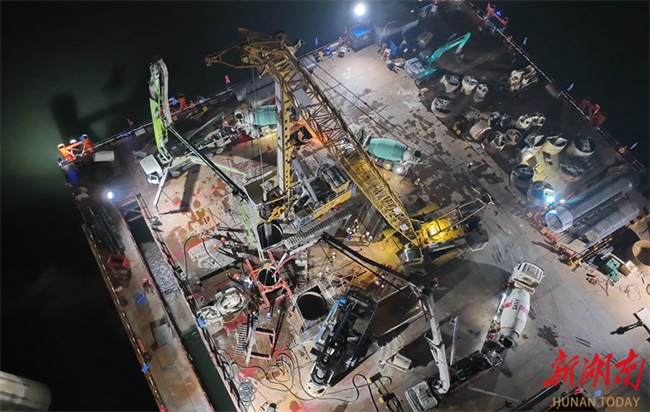 Construction of all 19 drilled piles for the No. 137 main pier of the Changsha Xiangjiang River Grand Rail-road Bridge has been completed by March 17. This rail-road bridge is a critical control project on the Changsha-Ganzhou High-speed Railway Hunan section. (Photo/Tong Di, Hunan Daily)