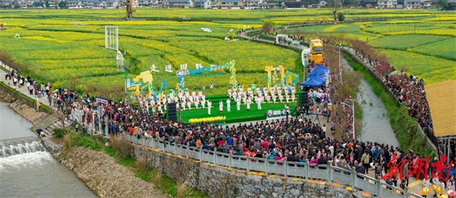 On March 28, the 2026 National Four Seasons Village Gala Demonstration Event kicked off at the Daoxiang Shitian Scenic Area in Baozi Town, Huitong County. Set against the natural backdrop of a vast sea of canola flowers, this immersive cultural event used village songs as the theme, blending agricultural customs, ethnic traditions, and melodies. It vividly showcased the poetic charm and vitality of rural areas in the new era, marking the spring prelude to the national "Four Season Village Gala" initiative. (Photo/Zhang Lei)