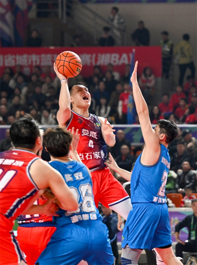 On the evening of March 29, the Loudi team (in red) competed with the Xiangtan team on its home court. Thanks to a steady performance and tough defense, the Loudi team ultimately secured its first home victory with a score of 91–76. (Photo/Liu Xinshan)