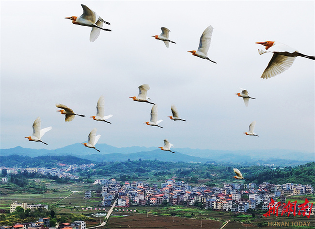 The photo, taken on April 7, shows flocks of birds flying along the banks of the Chongling River in Jiahe County. In recent years, the county authority has intensified efforts to improve the environment in both urban and rural areas, achieving continuous improvements in the living environment and natural ecosystems. The initiative has attracted large numbers of wild birds such as egrets to settle and breed in the area. (Photo/Huang Chuntao)