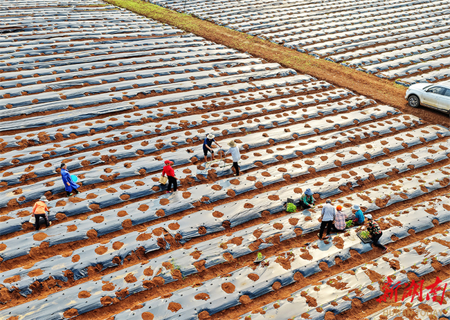 The photo, taken on April 9, shows farmers transplanting chili seedlings at a vegetable plantation in Longwang Village, Longtan Town, Jiahe County. In recent years, the town has focused on adjusting its agricultural industrial structure to develop a high-efficiency vegetable industry. It has rolled out an order-based planting model of "cooperatives + farmers + planting and harvesting + processing and sales", aiming to boost agricultural efficiency and increase farmers' income. (Photo/Huang Chuntao)