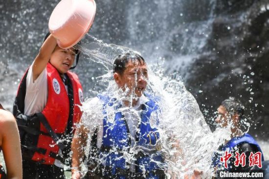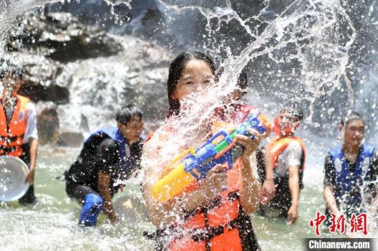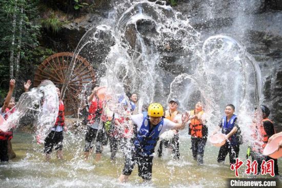 On July 30, many tourists participated in an 8-km river trekking and water-splashing contest at Jiulongjiang National Forest Park, Rucheng County, Chenzhou City, to avoid the summer heat.
