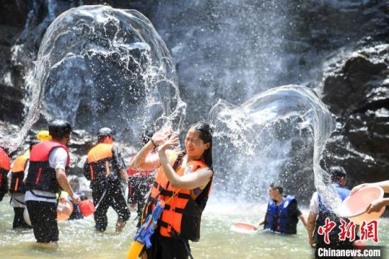 Tourists participate in a water-splashing contest. (Photo/Yang Huafeng)