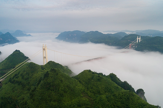 The photo above, taken on June 26, shows the Aizhai Super Grand Suspension Bridge was surrounded by clouds and mist in Aizhai Town, Jishou City. The spectacular scene has attracted many tourists. (Photo/Zhang Shujie)