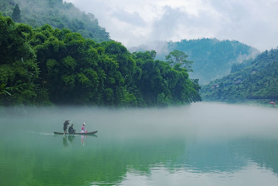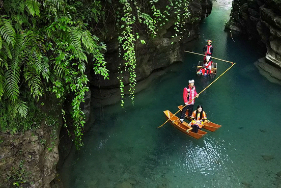 Wudaoshui Town, Sangzhi County, tourists take a boat ride around canyon. The valley’s