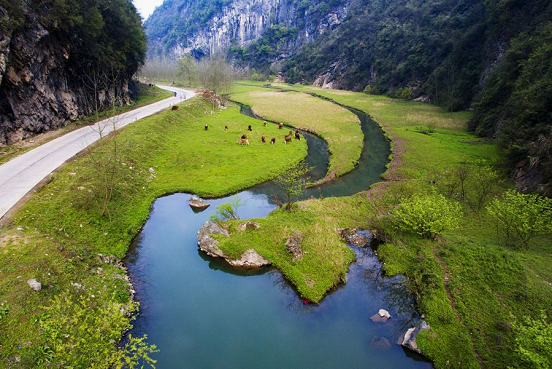 The Moon Stream in Zhuyeping, Sangzhi County, is clear and surrounded by green grass.