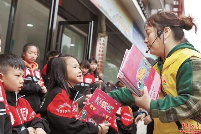 The photo, taken on October 20, shows children receive books from volunteers. Volunteers of Tongdao Dong Autonomous County went to the relocation community in Donghuan Road, Shuangjiang Town that day. They presented winter clothes and nearly 400 extracurricular books to 68 kids there. (Photo/Yin Xuping, Xu Yueming)