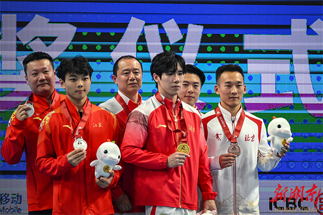 Zhang Boheng (3rd, R) poses on the podium during the awarding ceremony at China's 15th National Games. (Photo/Liu Feng and Ye Zhu, Hunan Daily)