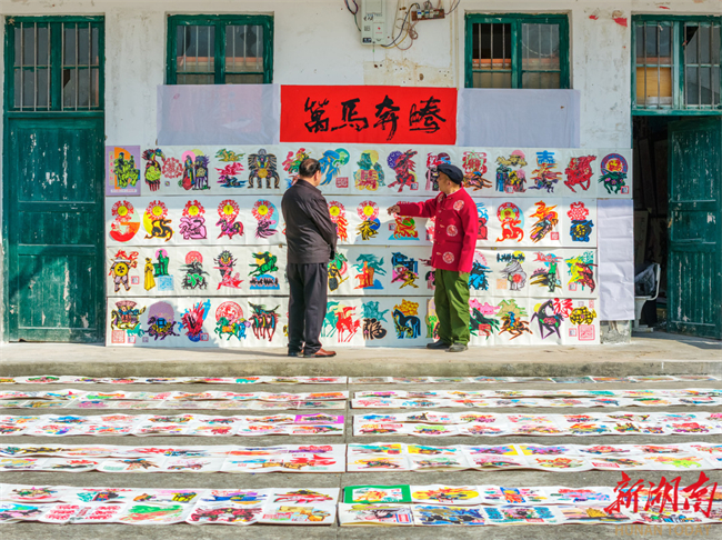 After 16-month hard work, Song Bingqian and his wife Tang Wuxiong accomplished their colored paper cutting scrolls Thousands of Steeds Gallop on January 14, presenting a cultural gift for Chinese lunar Year of the Horse. The scrolls consist of 32 volumes, with a total length of 146 meters. The photo shows villagers admiring the colored paper cutting scrolls Thousands of Steeds Gallop at Shiba Village, Duanqiaopu Town, Dong'an County.