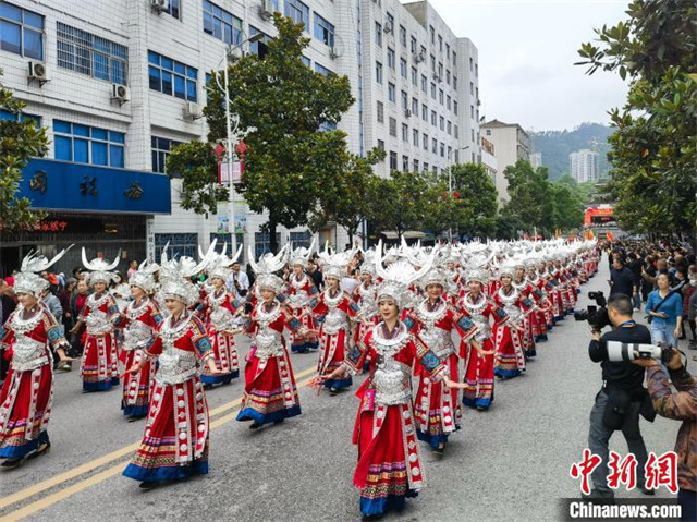 One hundred beautiful girls dressed in festive costumes, together with a lusheng team, parade through the city. (Photo/Gu Jingyi)