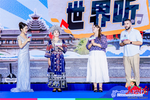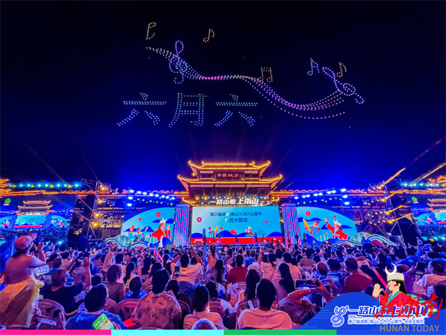 A grand public celebration of the 27th Hunan (Nanshan) Liuyueliu Folk Song Festival began with a folk dance performance, followed by a series of spectacular performances. These included an original folk song performance, an intangible cultural heritage showcase featuring Nuo dance, a folk song duet, an interactive program between international friends and the audience, a children's chorus, and a singing and dancing performance.