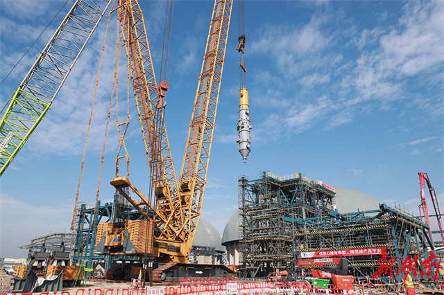 On November 24, the first 95-tonne large-scale equipment converter is hoisted into place for a biomass gasification flexible platform construction project of the SINOPEC Hunan Company. Currently, 80% of the steel structure for the project has been completed, with the gasification framework expected to be topped out by December 5. (Photo/Peng Zhan and Deng Jun)