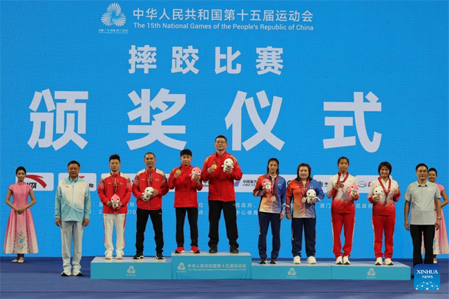 Gold medalist Zhang Jin of Jiangsu, silver medalist Pang Qianyu of Hunan, bronze medalist Luo Lannuan of Guangdong and bronze medalist Li Yuxuan of Guangxi pose for group photos with their coaches during the awarding ceremony for the women's freestyle 53kg of wrestling at China's 15th National Games in Qingyuan, south China's Guangdong Province, Nov. 10, 2025. (Xinhua/Li Ran)