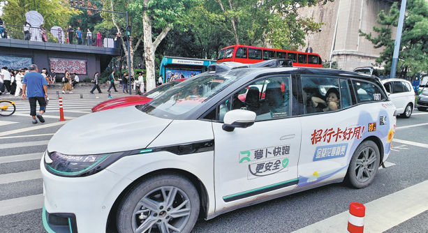 A driverless car from Apollo Go, Baidu's autonomous ride-hailing unit, runs in Wuhan, capital of Hubei province, on Oct 4. LI CHANGLIN/FOR CHINA DAILY