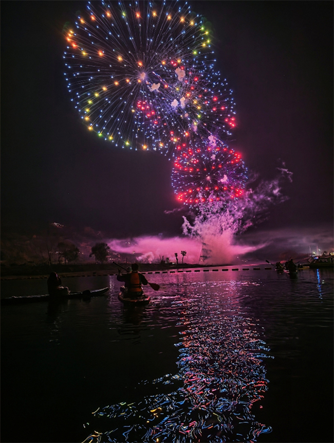 A show blending splendid fireworks with drones lights up the night sky in Liuyang, Central China's Hunan Province. Photo VCG