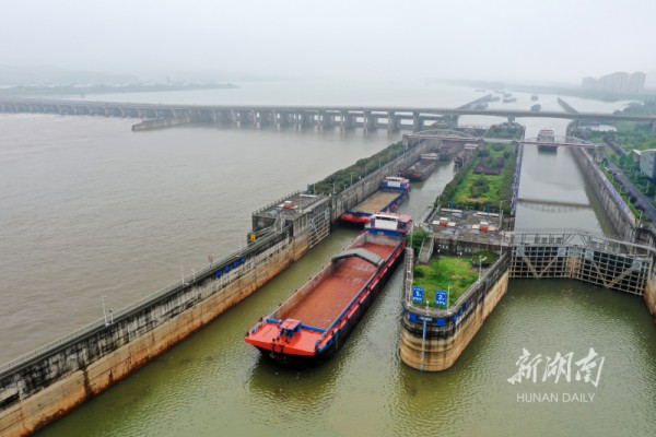 The photos above, taken on April 21, show freighters passing through the ship lock orderly at the Changsha Comprehensive Hub on Xiangjiang River. As of that day, the ship lock has operated safely for 3,126 days, and handled 95,000 times of lockage. A total of 500,000 vessels passed through the lock, with the freight volume reaching 530 million tons. (Photo/Yun Wenxue, Hunan Daily)