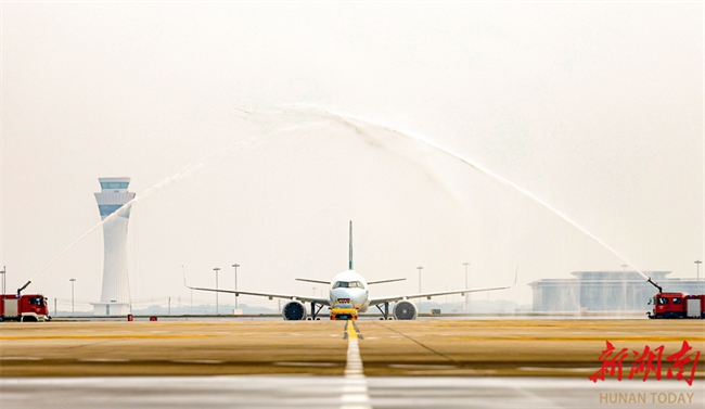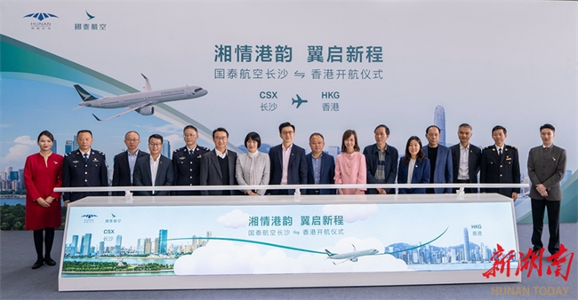 Flight CX968 operated by the Cathay Pacific Airways Limited took off from Hong Kong and landed at the Changsha Huanghua International Airport on November 4, marking the official launch of the airline's Hong Kong-Changsha air route. This new route establishes an efficient and convenient "air bridge" connecting China's central region with the Guangdong-Hong Kong-Macao Greater Bay Area. One round-trip flight is operated daily, with a one-way flight time of just one hour and 40 minutes. The launch of this route will further facilitate exchanges and cooperation between Hunan and Hong Kong in such fields as economy and trade, tourism, and culture. The photo shows the Cathay Pacific Airways Limited holding an inauguration ceremony for the new route (Photo/Tong Zhenxi and Yu Miao, Hunan Daily)