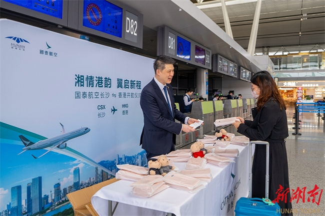 Flight CX968 operated by the Cathay Pacific Airways Limited took off from Hong Kong and landed at the Changsha Huanghua International Airport on November 4, marking the official launch of the airline's Hong Kong-Changsha air route. This new route establishes an efficient and convenient "air bridge" connecting China's central region with the Guangdong-Hong Kong-Macao Greater Bay Area. One round-trip flight is operated daily, with a one-way flight time of just one hour and 40 minutes. The launch of this route will further facilitate exchanges and cooperation between Hunan and Hong Kong in such fields as economy and trade, tourism, and culture. The photo shows a passenger receiving an inaugural flight souvenir at the Changsha Huanghua International Airport. (Photo/Tong Zhenxi and Yu Miao, Hunan Daily)