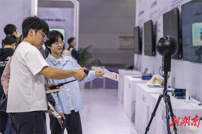 A model showcases VR scenarios at the 2025 China New Media Technology Exhibition (CMTE) at the Hunan International Convention and Exhibition Center (Mango Hall) on November 13. The exhibition is ongoing in Changsha, focusing on technology empowering the media throughout its entire workflow and across all aspects. It featured three core sections—"New Ecosystem of Intelligent Media," "New Application of Smart Media Technologies," and "New Consumption of Digital Cultural Innovation." The event aims to create a platform to showcase the achievements in technological innovations empowering systematic transformation of mainstream media, and to facilitate technology transactions and industrial collaboration. (Photo/Tong Zhenxi and Liu Shiqi, Hunan Daily)