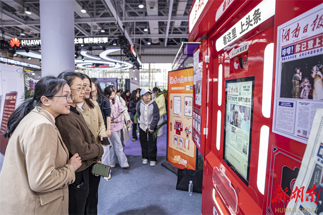 Visitors experiences an automated newspaper photography machine at the 2025 China New Media Technology Exhibition (CMTE) at the Hunan International Convention and Exhibition Center (Mango Hall) on November 13. The exhibition is ongoing in Changsha, focusing on technology empowering the media throughout its entire workflow and across all aspects. It featured three core sections—"New Ecosystem of Intelligent Media," "New Application of Smart Media Technologies," and "New Consumption of Digital Cultural Innovation." The event aims to create a platform to showcase the achievements in technological innovations empowering systematic transformation of mainstream media, and to facilitate technology transactions and industrial collaboration. (Photo/Tong Zhenxi and Liu Shiqi, Hunan Daily)