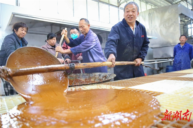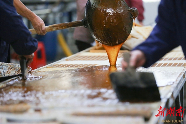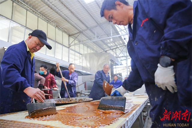 The photo, taken on November 29, shows workers pouring freshly prepared brown sugar into trays for cooling at Laowu Village, Shanjie Hui Ethnic Township, Longhui County. (Photo/Zeng Yong and Sun Zhongkun)