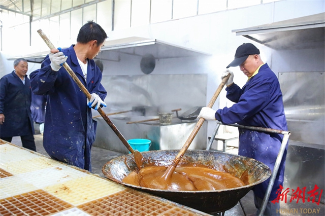 The photo, taken on November 29, shows workers preparing brown sugar using traditional techniques at Laowu Village, Shanjie Hui Ethnic Township, Longhui County. (Photo/Zeng Yong and Sun Zhongkun)