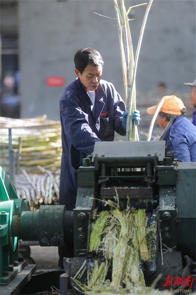 The photo, taken on November 29, shows villagers extracting juice from harvested sugarcane at Laowu Village, Shanjie Hui Ethnic Township, Longhui County. (Photo/Zeng Yong and Sun Zhongkun)