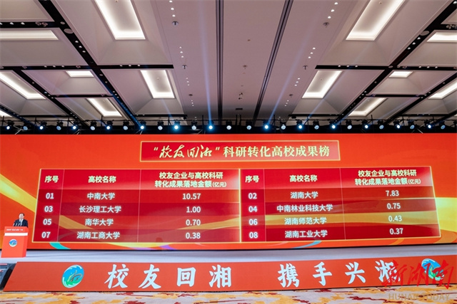 A conference to motivate the alumni of Hunan's universities to return to Hunan was held in Changsha on December 2, 2025. Over a thousand Hunan alumni gathered by the Xiangjiang River to jointly celebrate this grand event and collaborate in charting a grand vision for Hunan's prosperity. The photo shows the ranking of commercialization of scientific and technological achievements jointly made by Hunan's universities and alumni enterprises. (Photo/Tong Zhenxi, Hunan Daily)