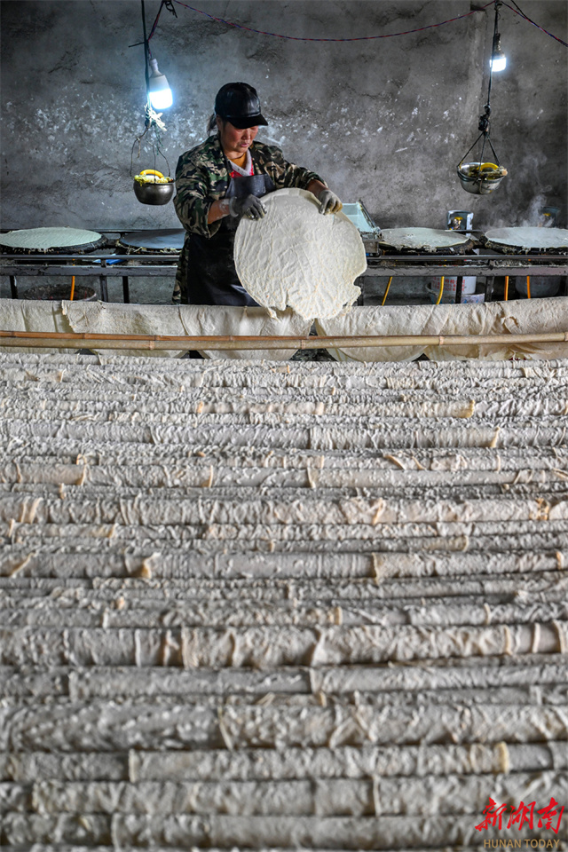 The photo, taken on January 5, shows a villager making buckwheat bean curd sheets in a workshop at Baimamiao Village, Yanjing Town, Lixian County. Every winter, locals have the tradition to make buckwheat bean curd sheets, which serve both as daily fare and as a treat for guests. As the Spring Festival approaches, numerous workshops and villagers have begun producing buckwheat bean curd sheets, turning this smooth, chewy, and nutritious local specialty into the warmest festive flavor in people's memories. Currently handmade buckwheat bean curd sheets not only evoke a sense of nostalgia, but have also developed into a distinctive industry that boosts farmers' income. (Photo/Guo Lilaing, Hunan Daily)