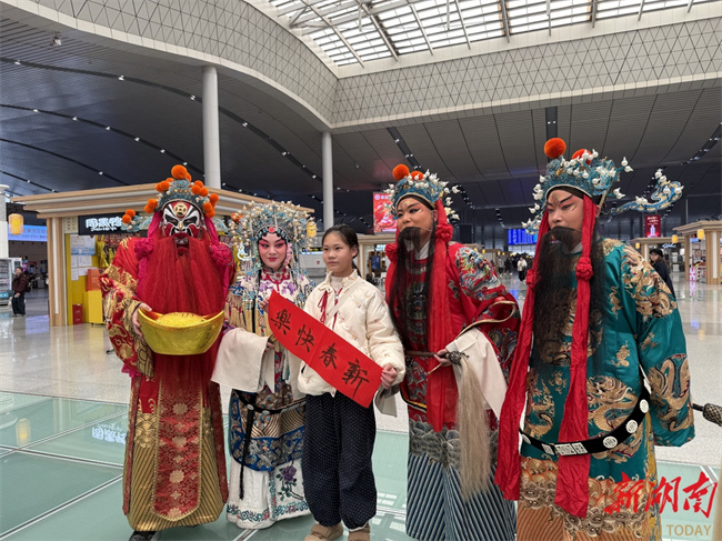 A variety of live folk performances like puppet shows, dramatic "face-changing," and acrobatics were staged to captivate the travelers. Six performers dressed as the mythical "Ne Zha" riding on "wind-and fire wheels" wove through the crowd handing out the Chinese character "Fu," symbolizing blessings. "I simply can't get enough of it, but I have just two minutes left to catch my train," remarked Mr. Wang, traveling from Changsha to Ganzhou. This was his first time experiencing Hunan's intangible cultural heritage performances, which he found fascinating. He looked forward to future opportunities to explore such traditions.