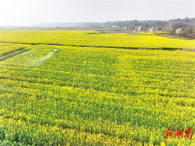 A plant protection drone conducts aerial operations over a canola flower field in Shizhuang Village, Huolianpo Town, Lixian County. The canola plants have entered a critical time for spring management recently. Taking advantage of the recent sunny weather, local farmers have been using drones to spray a mixture of pest control agents and foliar fertilizers, significantly enhancing field management efficiency and paving the way for a bumper harvest. (Photo/Bai Yipu)