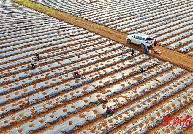 The photo, taken on April 9, shows farmers transplanting chili seedlings at a vegetable plantation in Longwang Village, Longtan Town, Jiahe County. In recent years, the town has focused on adjusting its agricultural industrial structure to develop a high-efficiency vegetable industry. It has rolled out an order-based planting model of "cooperatives + farmers + planting and harvesting + processing and sales", aiming to boost agricultural efficiency and increase farmers' income. (Photo/Huang Chuntao)