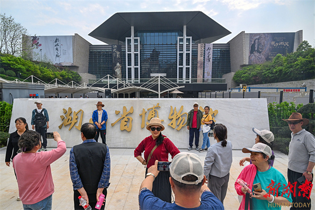 On April 9, visitors took photos in front of the newly-constructed cultural landmark stone of the Hunan Museum. Currently, the "museum-park integration" project linking the Hunan Museum and Hunan Martyrs Park is nearing completion. Launched in last June, the project covers an area of 29,000 square meters, centering on the idea of "museum plus park." The efforts aim to achieve museum-park integrated development through unified construction. The initiative boasts "integration of spaces, resources, and business formats and traffic circulation." The project connects the Hunan Museum with the Hunan Martyrs Park, comprehensively upgrading the facilities to create a seamless transition between cultural and natural landscapes. (Photo/Guo Liliang, Hunan Daily)