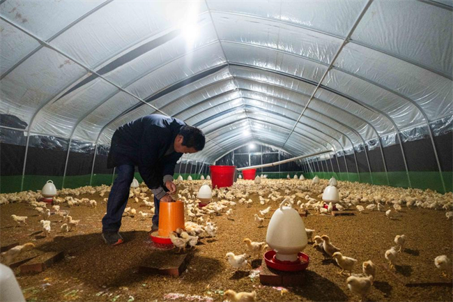 A staff member of a chicken breeding cooperative feed chickens in Yuefeng Village, Guyuefeng Town on April 15. (Photo/Chen Sihan, Xinhua)